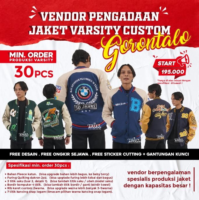 Bagi Anda yang sedang mencari jaket varsity Gorontalo berkualitas dengan harga terjangkau dan layanan desain gratis, WHS KONVEKSINDO adalah pilihan tepat. Kami menawarkan jaket varsity dengan bahan premium, desain custom, serta produksi yang cepat dan tepat waktu. Jadikan jaket varsity Anda lebih keren dan berkelas bersama WHS KONVEKSINDO.
