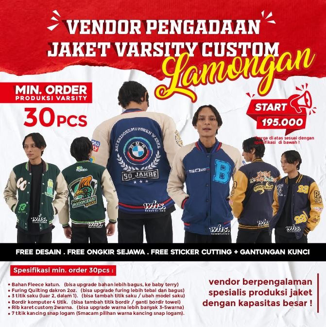 Di era fashion modern saat ini, jaket varsity menjadi salah satu item pakaian yang tidak hanya digunakan untuk keperluan gaya, tetapi juga identitas. Baik untuk komunitas, sekolah, organisasi, hingga perusahaan, jaket varsity menawarkan kesan eksklusif dan elegan. Di Lamongan, salah satu produsen konveksi yang mengkhususkan diri dalam pembuatan varsity jaket dengan kualitas terbaik adalah WHS KONVEKSINDO.